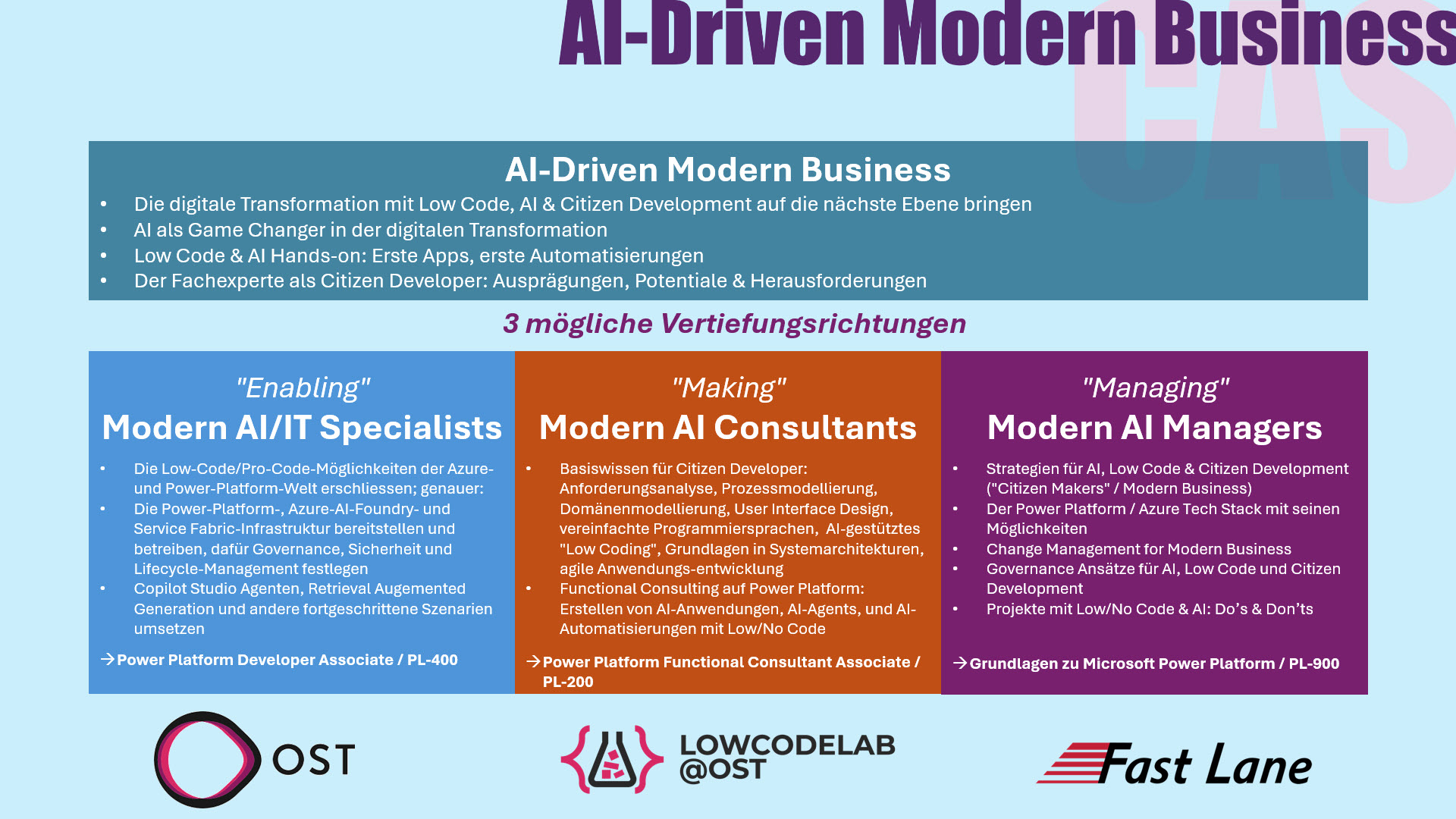«Two in one»: Der CAS wird in Kooperation mit Fast Lane durchgeführt, einem international tätigen Anbieter für Technologie- und Business-Trainings u.a. im Themengebiet der digitalen Transformation. Dank dieser Kooperation eröffnet der CAS nicht nur den Erwerb eines Certificates of Advanced Studies, seine Praxisteile bereiten auch auf Zertifizierungsmöglichkeiten zu den eingesetzten Microsoft Technologien vor. Andersherum können vorhandene Zertifikate für den CAS angerechnet werden.