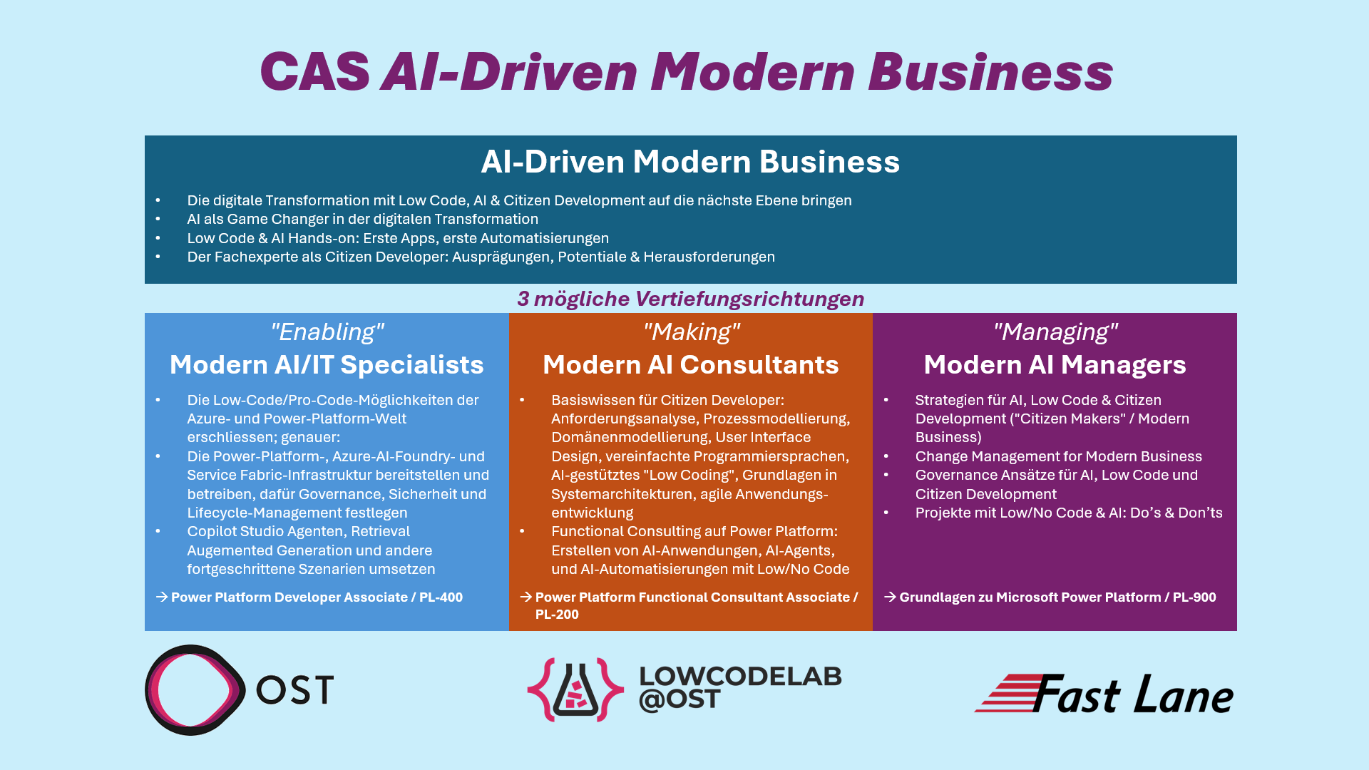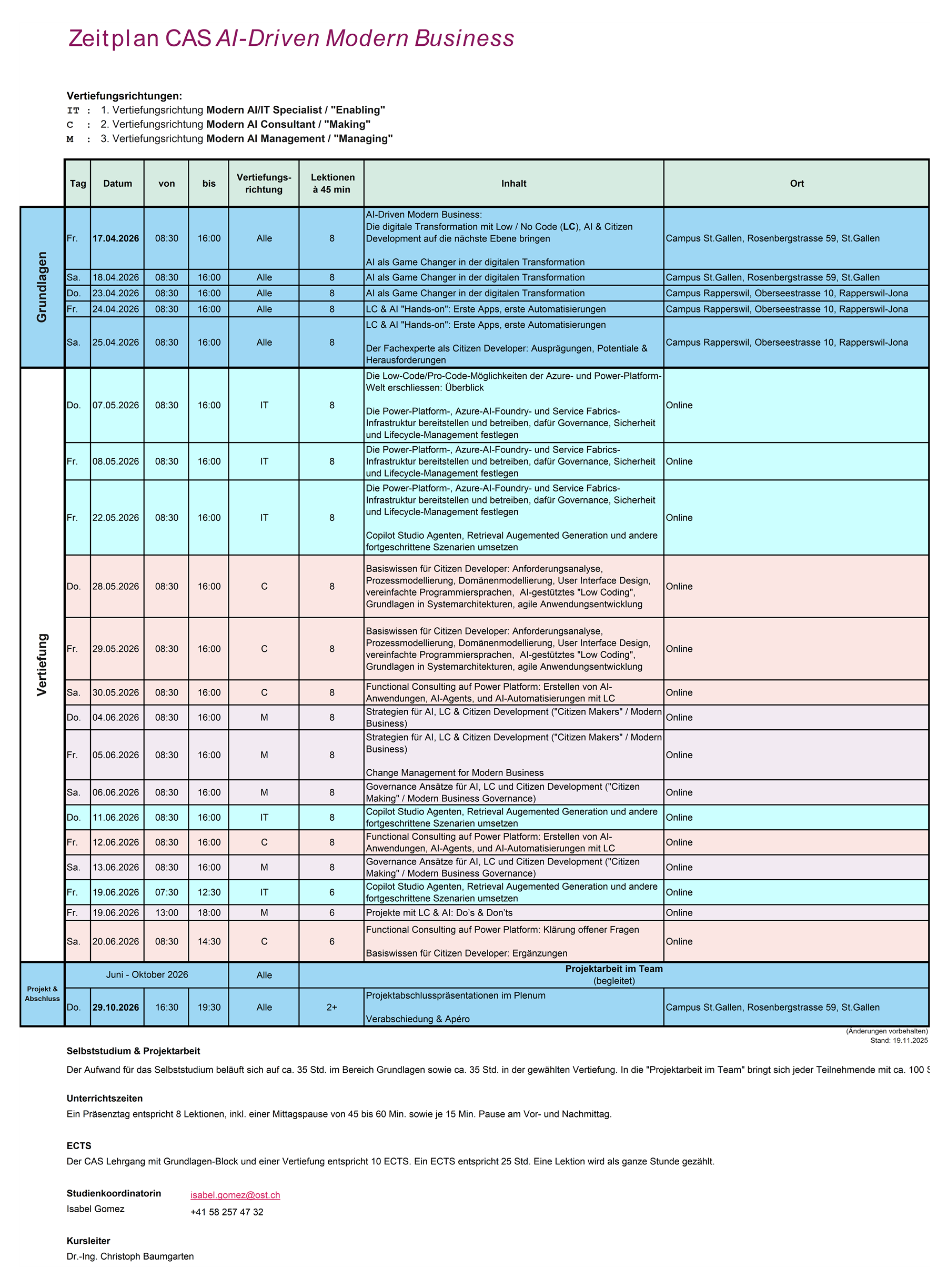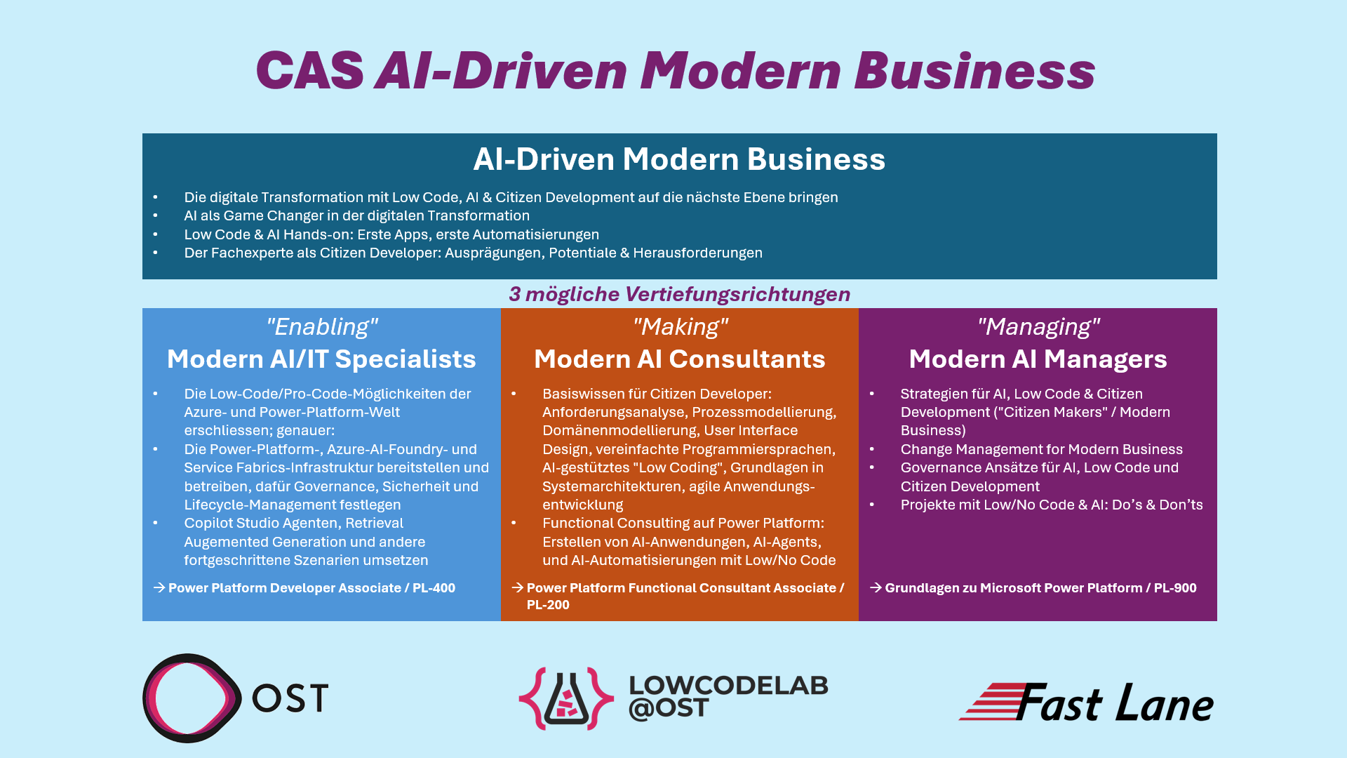 Ein Modern Business nutzt konsequent die Möglichkeiten der Digitalisierung. Es stützt sich insb. auf AI- und Low-Code-Ansätze, um ungenutzte Potentiale in seiner digitalen Transformation zu realisieren. Der CAS vermittelt die Grundlagen und Methoden dieses Digitalisierungsansatzes und zeigt, wie sie mit den AI- und Low-Code-Werkzeugen eines ausgewählten Anbieters - Microsoft in der momentanen Ausprägung des CAS - praktisch umgesetzt werden können. Dabei bietet der CAS drei Vertiefungsmöglichkeiten an, für Teilnehmende